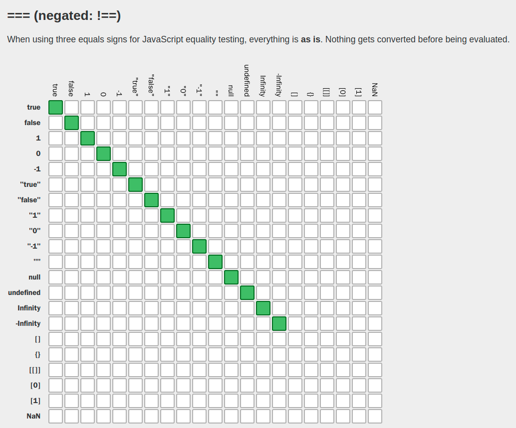 === (negated: !==) When using three equals signs for JavaScript equality testing, everything is as is. Nothing gets converted before being evaluated.