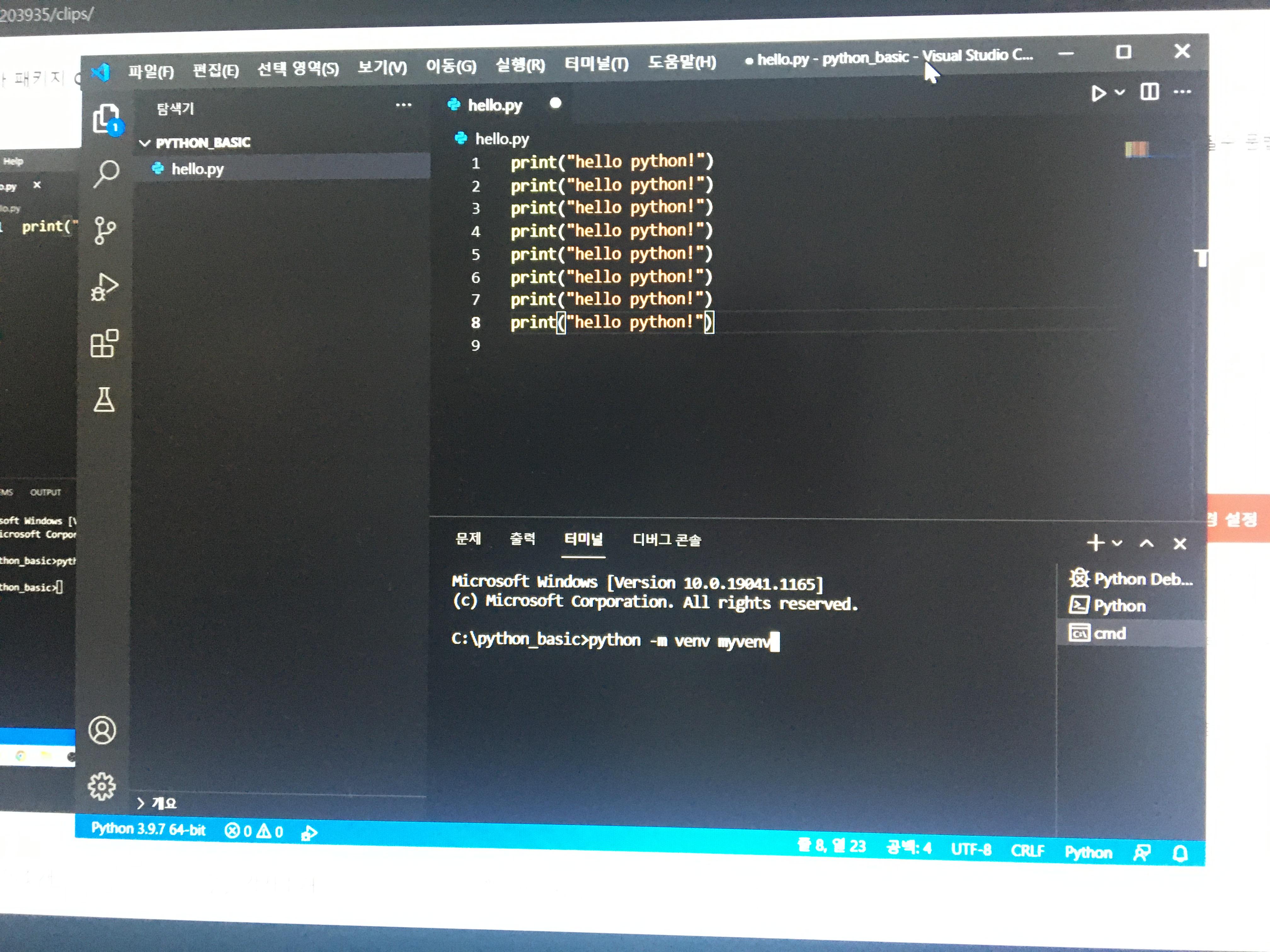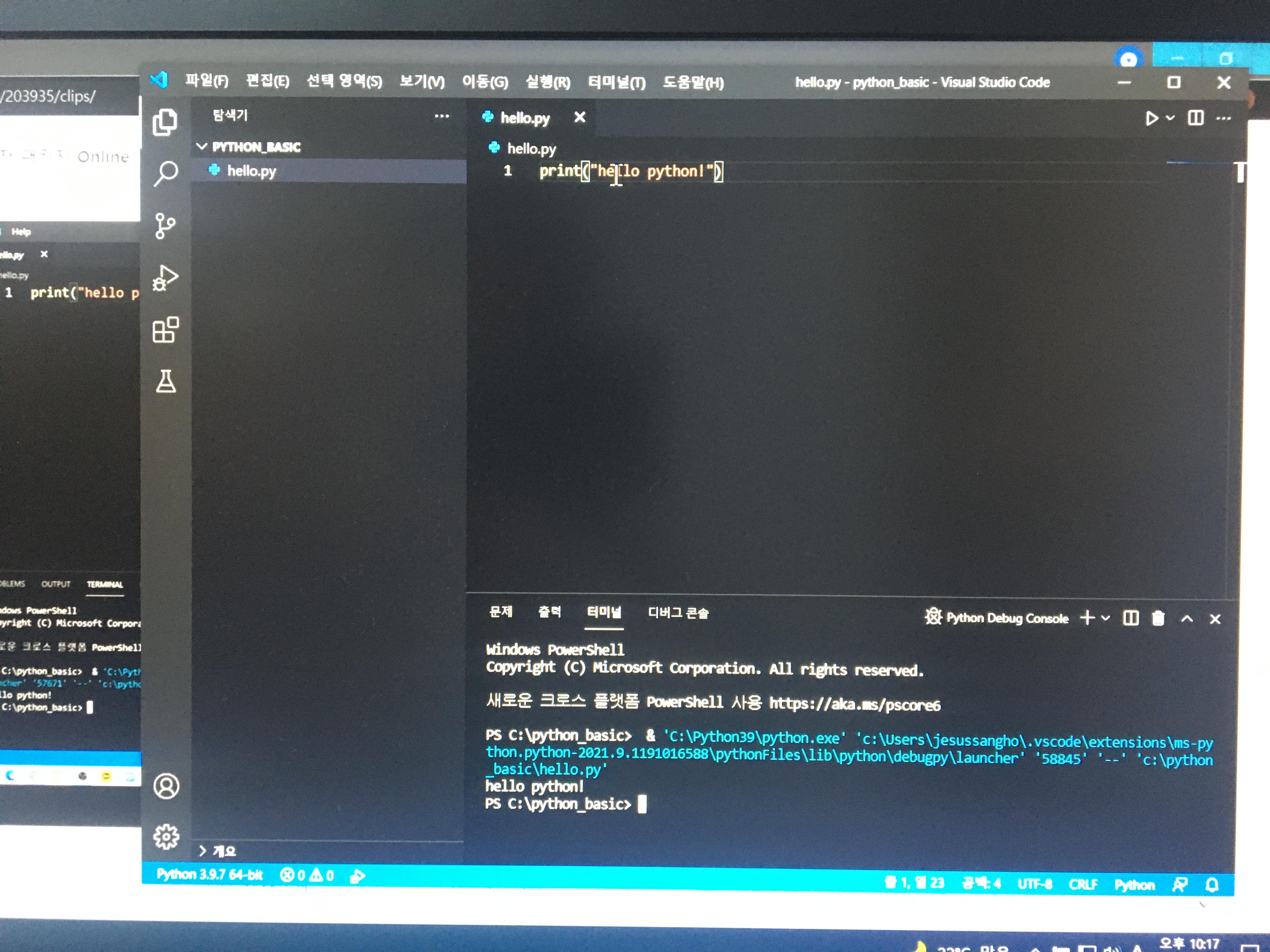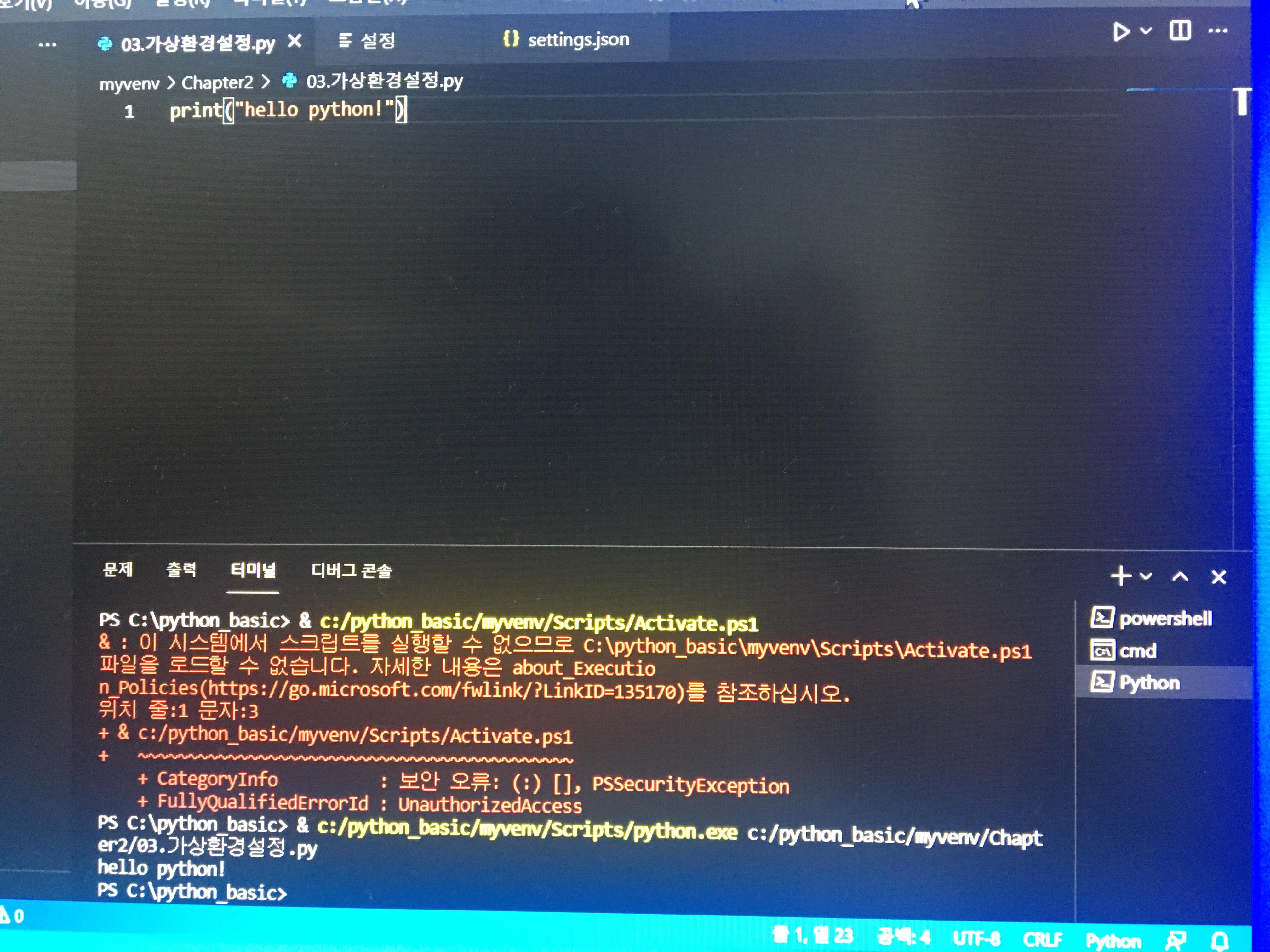 - python 실행 2 : 우측 상단 삼각형 버튼 클릭 실행