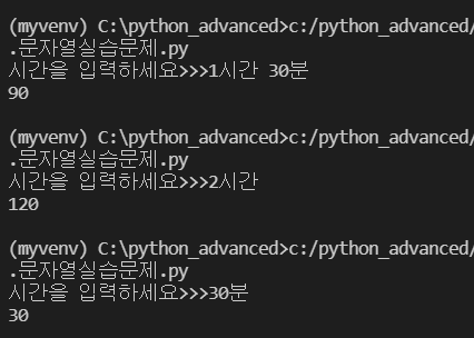 지도 어플리케이션에서 소요시간을 크롤링 하였더니 문자열 데이터 였다. 소요시간을 비교하기 위해 시간을 모두 분으로 바꾸려고 한다. 다음과 같이 시간이 입력되면 분으로 바꾸어 주는 프로그램을 작성해보자.