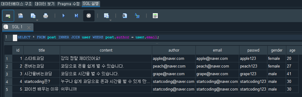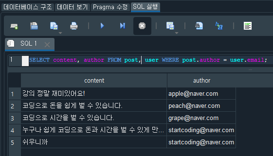 오늘은 SQL GROUP BY, JOIN 테이블(을)를 학습하는 시간을 가져 보았다. user, post 테이블을 직접 수정도 해보았으며 그룹 정렬해서 해당 값을 추출해보면서 해당 명령어를 입력해봤다. JOIN은 테이블을 합쳐서 원하는 결과값을 추출하는 명령어인데 이런저런 테스트해 보면서 조인 명령어가 없을 때와 비교도 해보았다. 이렇게 테스트를 하면 그렇게 심한 차이를 못 느끼는 경우가 많긴 하지만 JOIN의 중요성은 1:N, N:N 할 때 필요함을 많이 느낄 것이다. 아직도 웹 전반적인 실습으로 들어간 느낌이 없어서 JOIN 중요성이 크게 강조되지 않았다고 느껴지는 것 같다.