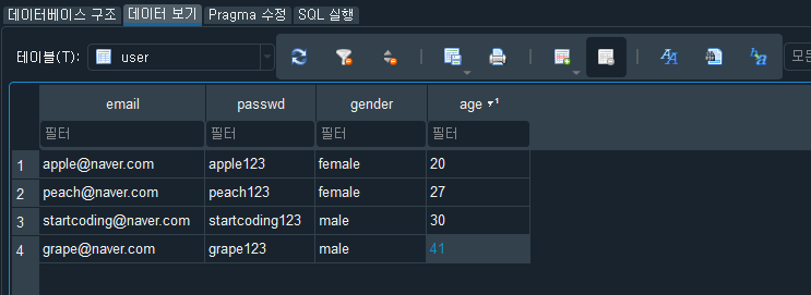 email, passwd, gender : user 테이블