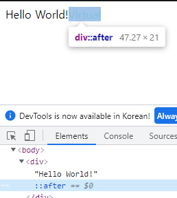 오늘은 가상 요소 선택자에 대해서 짧게 학습해보는 시간을 가졌다. CSS 코드를 보면서 종종 보곤 했는데 이런 뜻이 담겨있는지 전혀 몰랐었다. before, after를 통해 앞이나 뒤에서 가상 요소를 선택해서 출력해주는 모습을 보게 된다. Elements에는 값이 들어 있는 것처럼 안 보이지만 실제로 웹상에서 출력되는 모습을 보게 된다. 앞으로 코드 볼 때 before, after를 보게 되면 어떤 의미가 담겨있는지 더 살펴볼 수가 있을 것 같다.