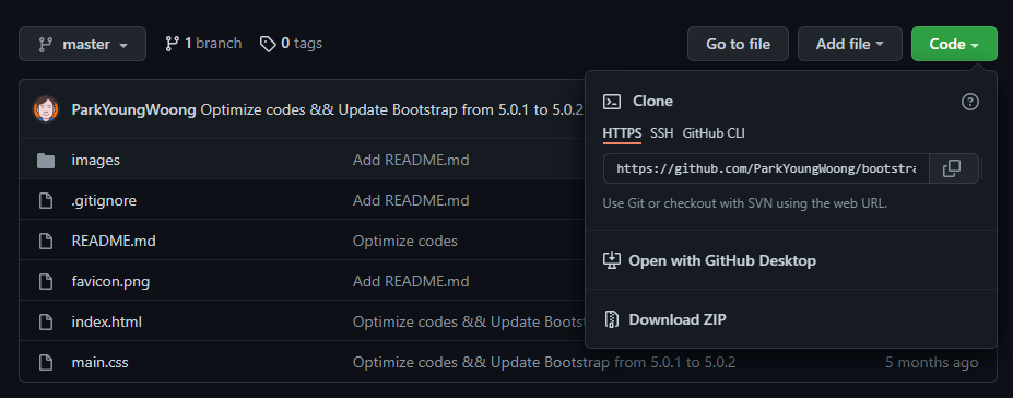 git clone https://github.com/ParkYoungWoong/bootstrap5-github-landing.git